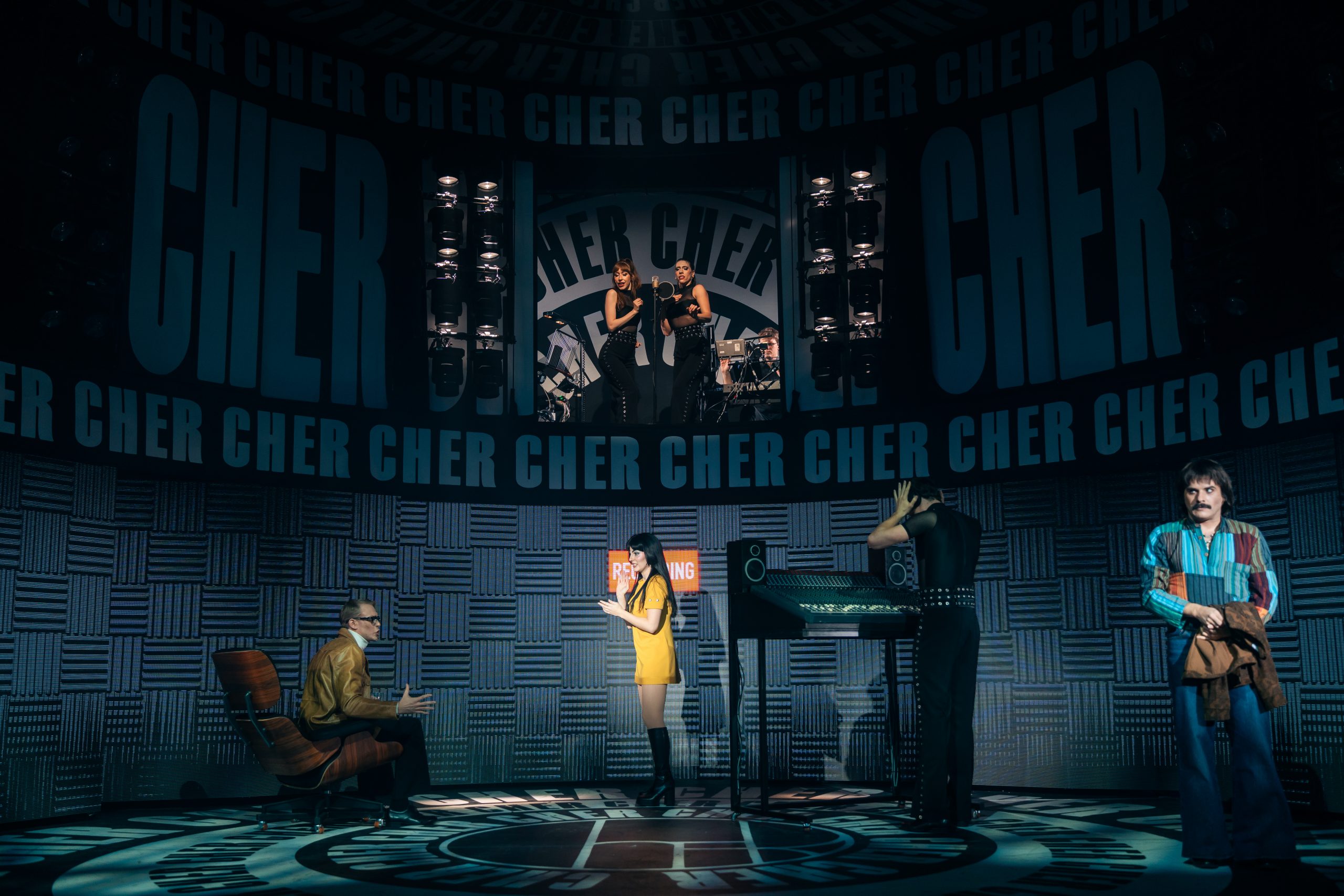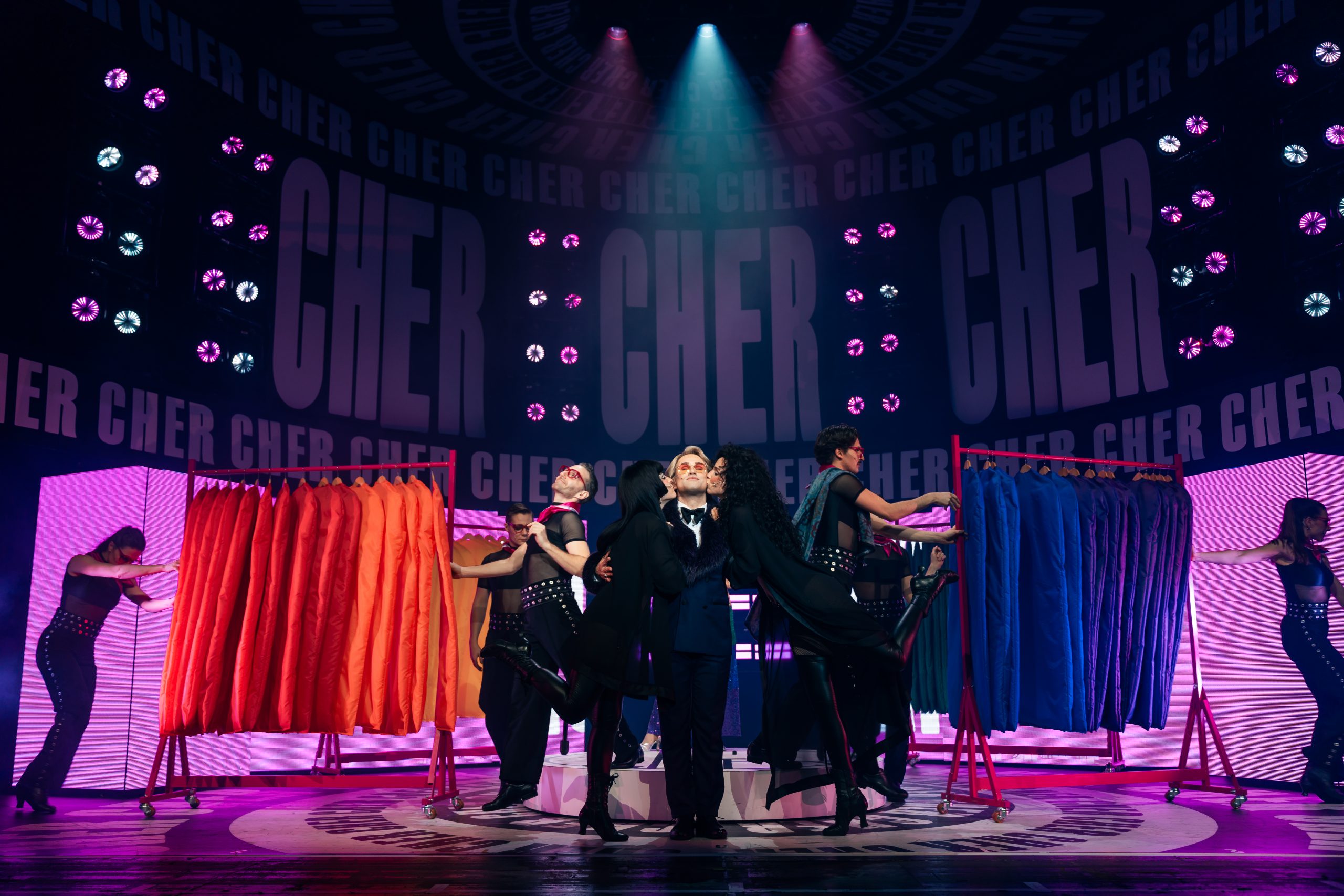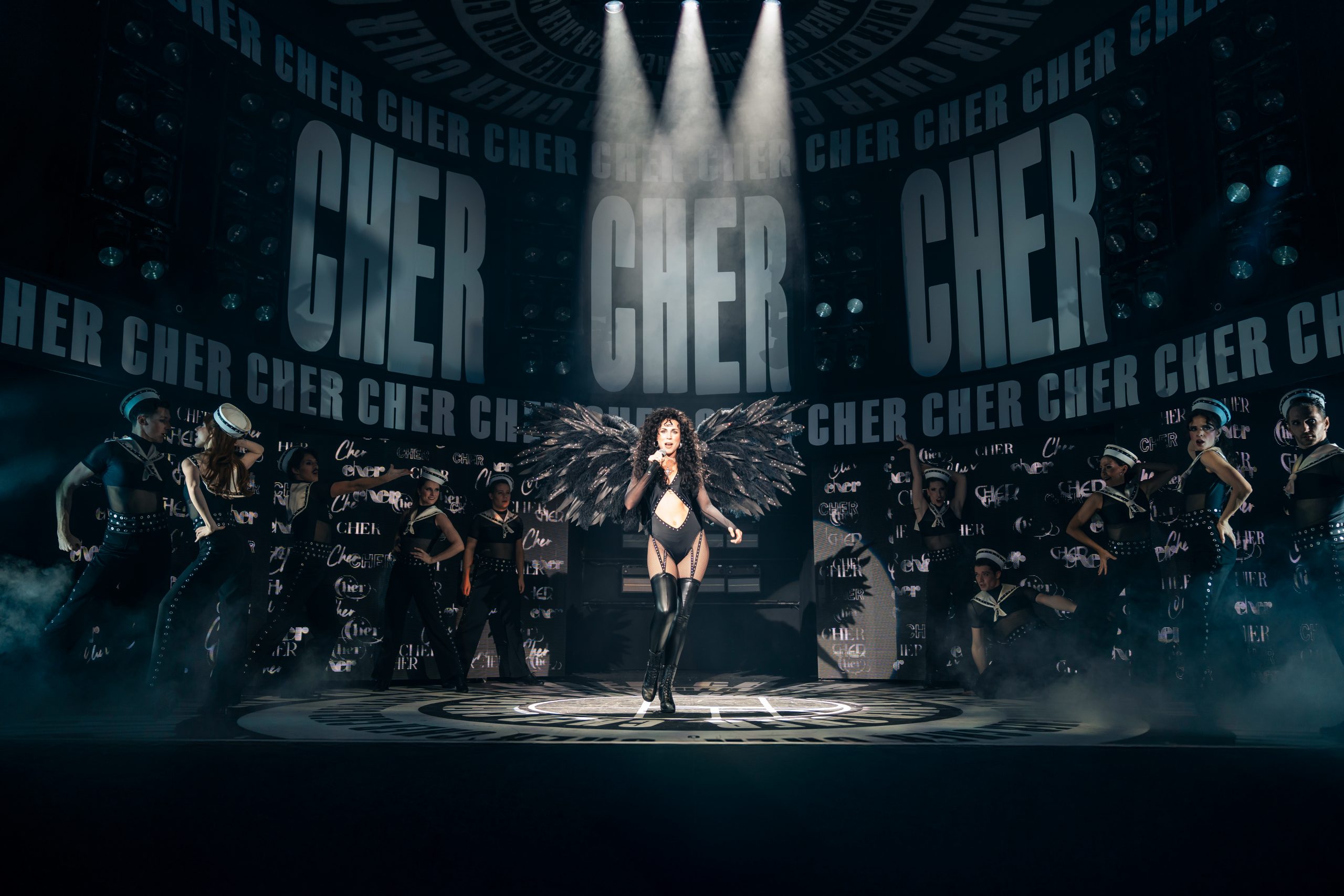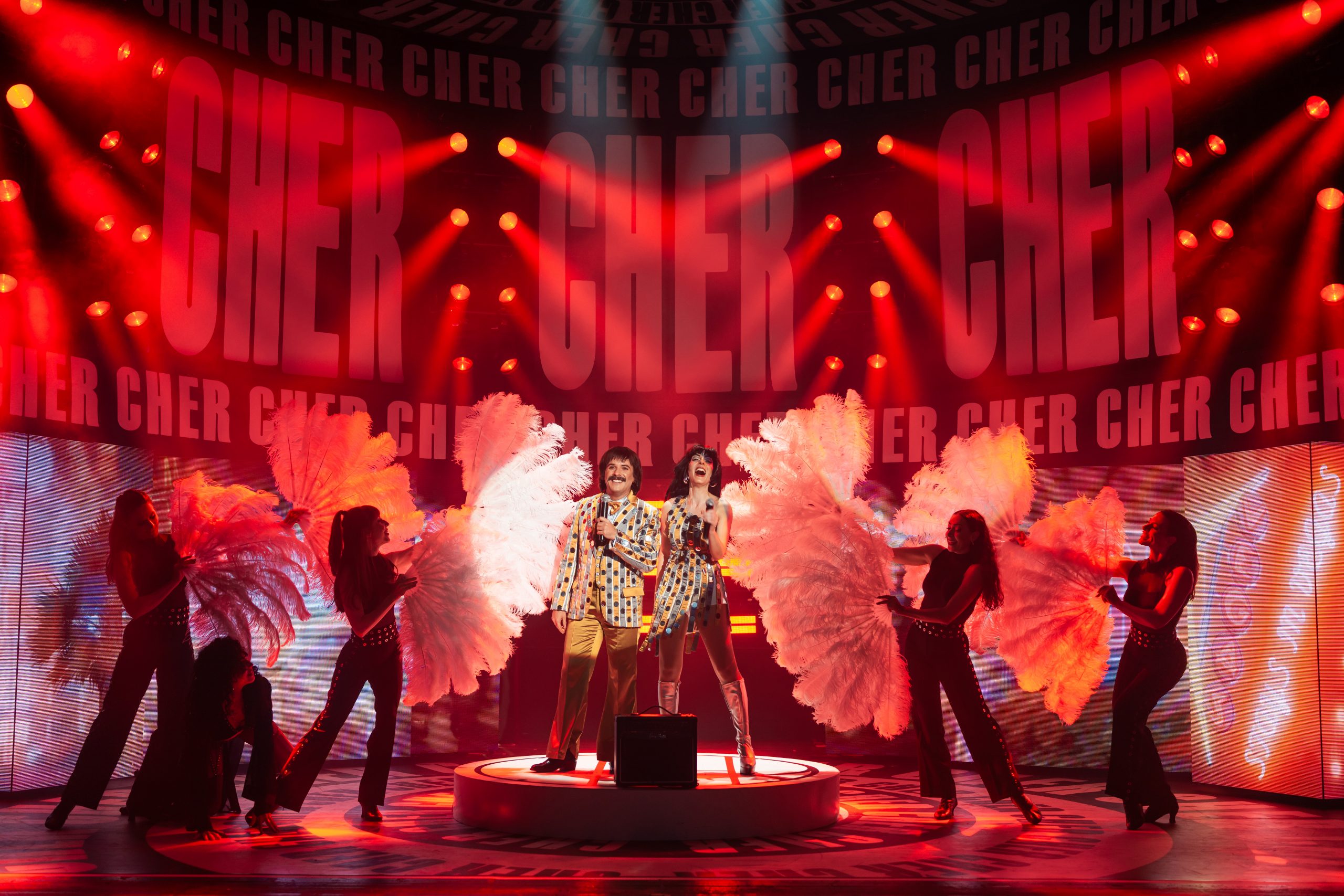 Erzählt wird die Lebensgeschichte von Cher, die in jungen Jahren gleich mit Sonny einen Seelenverwandten getroffen hat und groß durchstartete. Um die mittlerweile 60-jährige Bühnenerfahrung gut darstellen zu können, wird die Hauptperson des Abends gleich von 3 Darstellerinnen verkörpert – und gesungen: Jede repräsentiert eine Lebensphase, sie träumen, zweifeln und kämpfen miteinander bzw. auch füreinander. Anders als erwartet sind die 3 Chers auch oft gleichzeitig auf der Bühne, beratschlagen sich und bringen so eine ganz neue Dynamik in die Show. Dieses Konzept stammt von Grammy-Preisträger Rick Elice, und es ist eine gelungene und sehr unterhaltsame Show daraus geworden, die von der starken Regie von Christopher Tölle profitiert. Stimmlich sind die drei Ladys (Sophie Berner, Hannah Leser und Pamina Lenn) alle dem Original sehr ähnlich, und doch bringt jede einen eigenen Stil mit hinein, was für ein Feuerwerk in den Ohren sorgt. Zusammen mit dem wirklich sehr gut gelösten Bühnen-/Lichtdesign von Andrew Exeter (endlich mal keine schon für viele Touren wohl obligatorischen drehbaren Treppen!), den bunten und schrillen Kostümen von Heike Seidler (teilweise versehen mit bekannten Original-Kostüme von Emmy-Preisträger Bob Mackie), dem poppigen Disko-Sound und einer starken Cast bringt das ganze einen sehr unterhaltsamen Abend, der viel zu rasch endet!