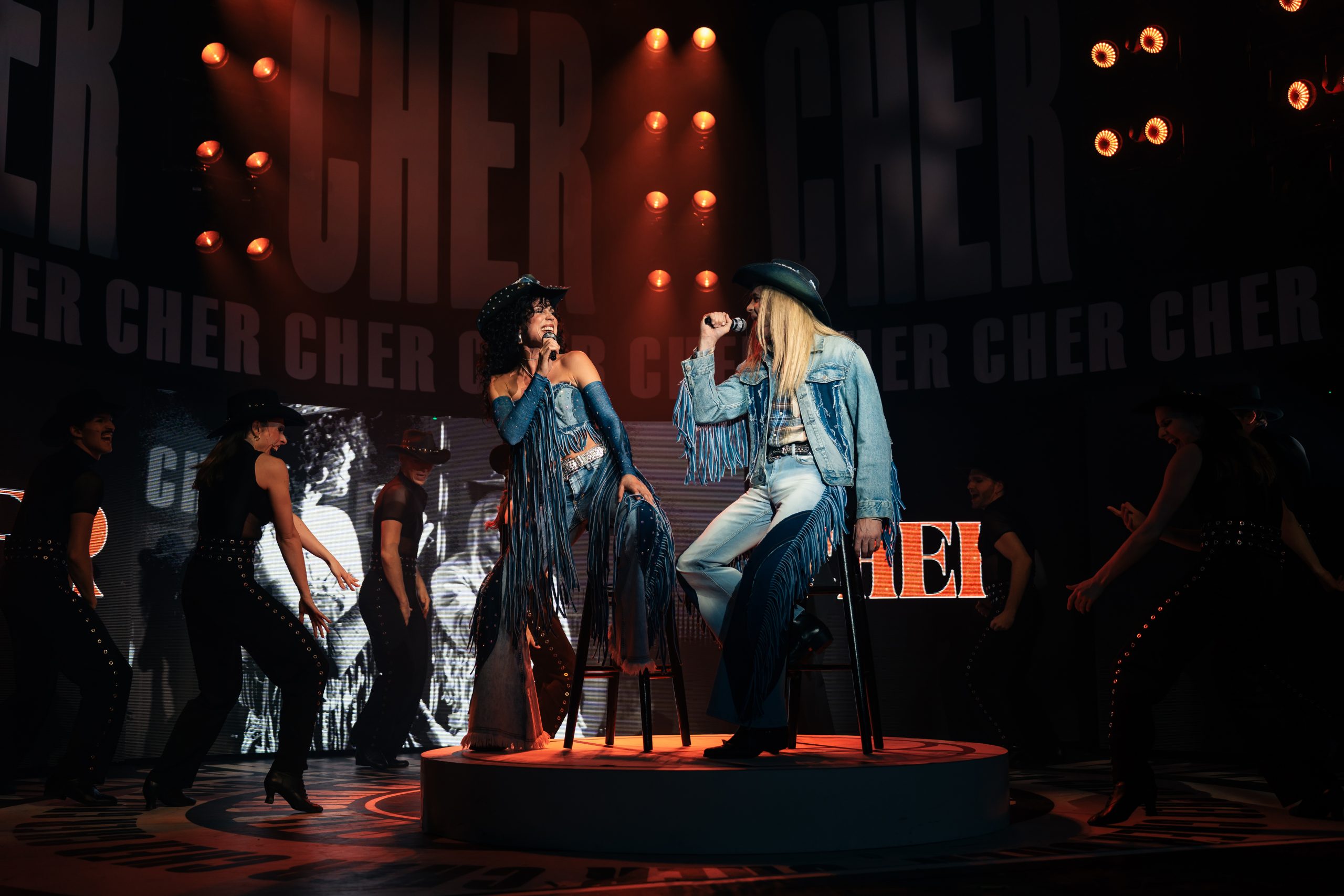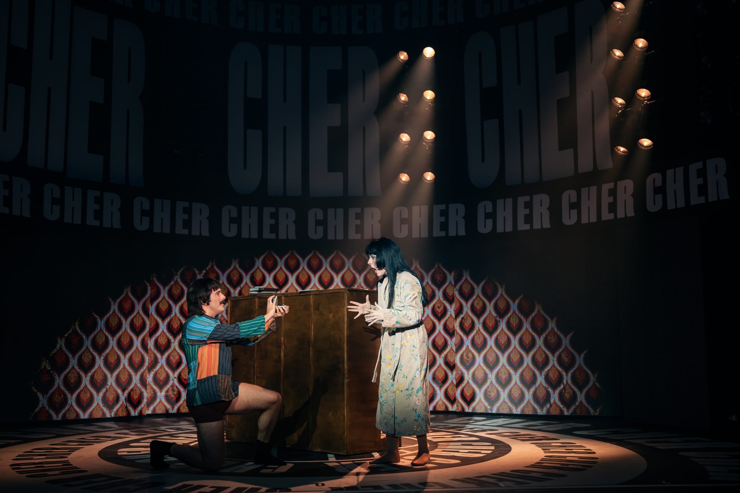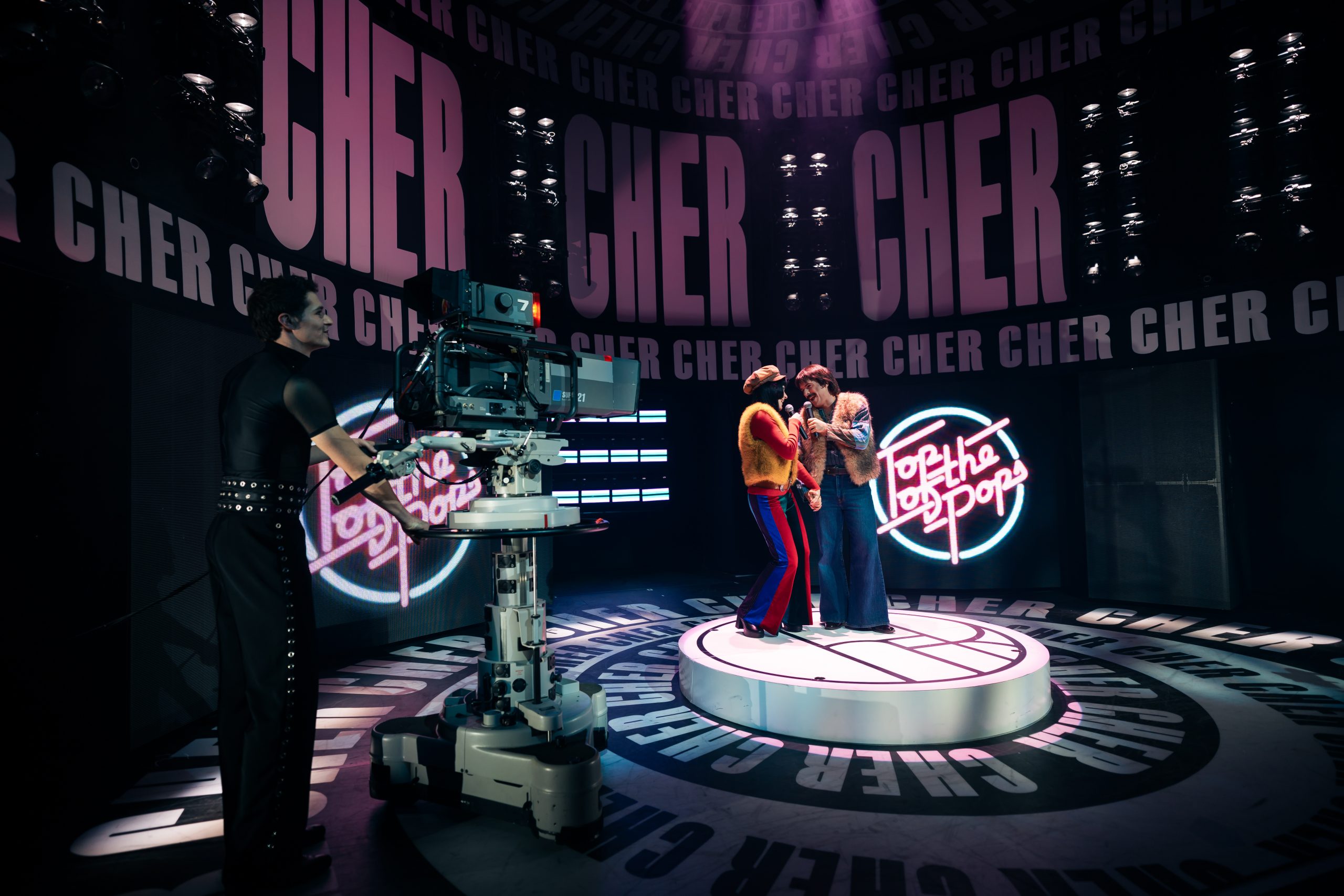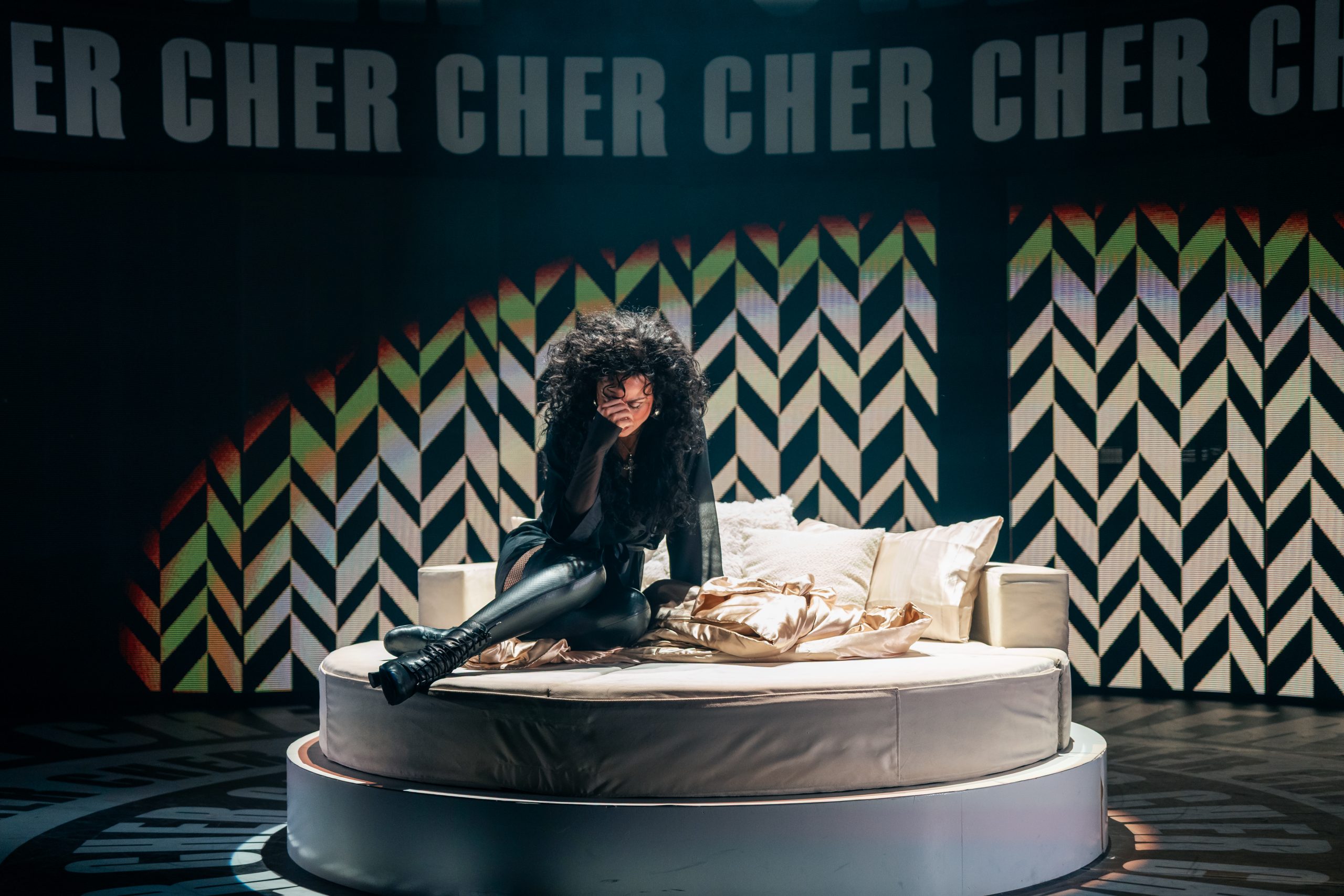 Erzählt wird die Lebensgeschichte von Cher, die in jungen Jahren gleich mit Sonny einen Seelenverwandten getroffen hat und groß durchstartete. Um die mittlerweile 60-jährige Bühnenerfahrung gut darstellen zu können, wird die Hauptperson des Abends gleich von 3 Darstellerinnen verkörpert – und gesungen: Jede repräsentiert eine Lebensphase, sie träumen, zweifeln und kämpfen miteinander bzw. auch füreinander. Anders als erwartet sind die 3 Chers auch oft gleichzeitig auf der Bühne, beratschlagen sich und bringen so eine ganz neue Dynamik in die Show. Dieses Konzept stammt von Grammy-Preisträger Rick Elice, und es ist eine gelungene und sehr unterhaltsame Show daraus geworden, die von der starken Regie von Christopher Tölle profitiert. Stimmlich sind die drei Ladys (Sophie Berner, Hannah Leser und Pamina Lenn) alle dem Original sehr ähnlich, und doch bringt jede einen eigenen Stil mit hinein, was für ein Feuerwerk in den Ohren sorgt. Zusammen mit dem wirklich sehr gut gelösten Bühnen-/Lichtdesign von Andrew Exeter (endlich mal keine schon für viele Touren wohl obligatorischen drehbaren Treppen!), den bunten und schrillen Kostümen von Heike Seidler (teilweise versehen mit bekannten Original-Kostüme von Emmy-Preisträger Bob Mackie), dem poppigen Disko-Sound und einer starken Cast bringt das ganze einen sehr unterhaltsamen Abend, der viel zu rasch endet!