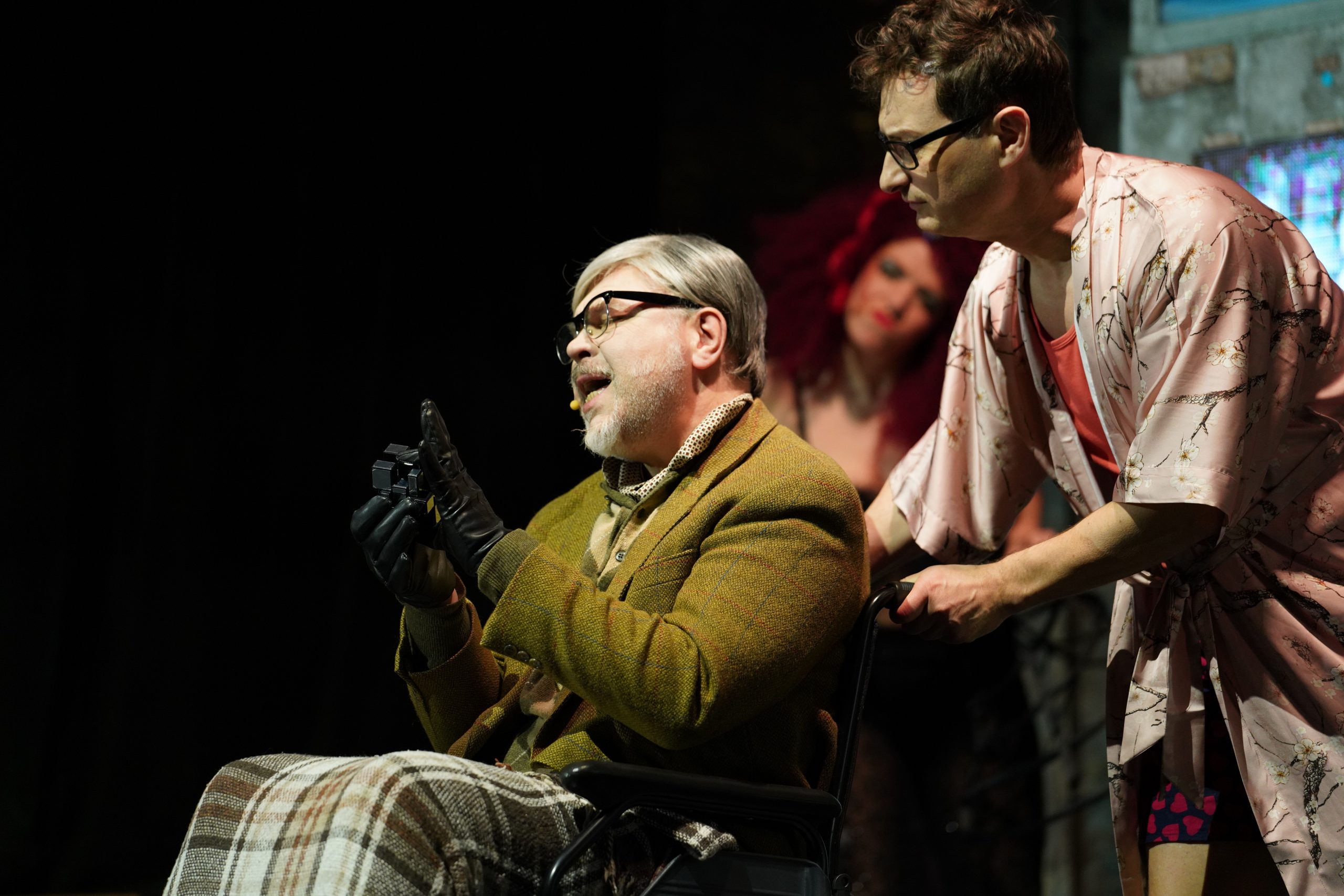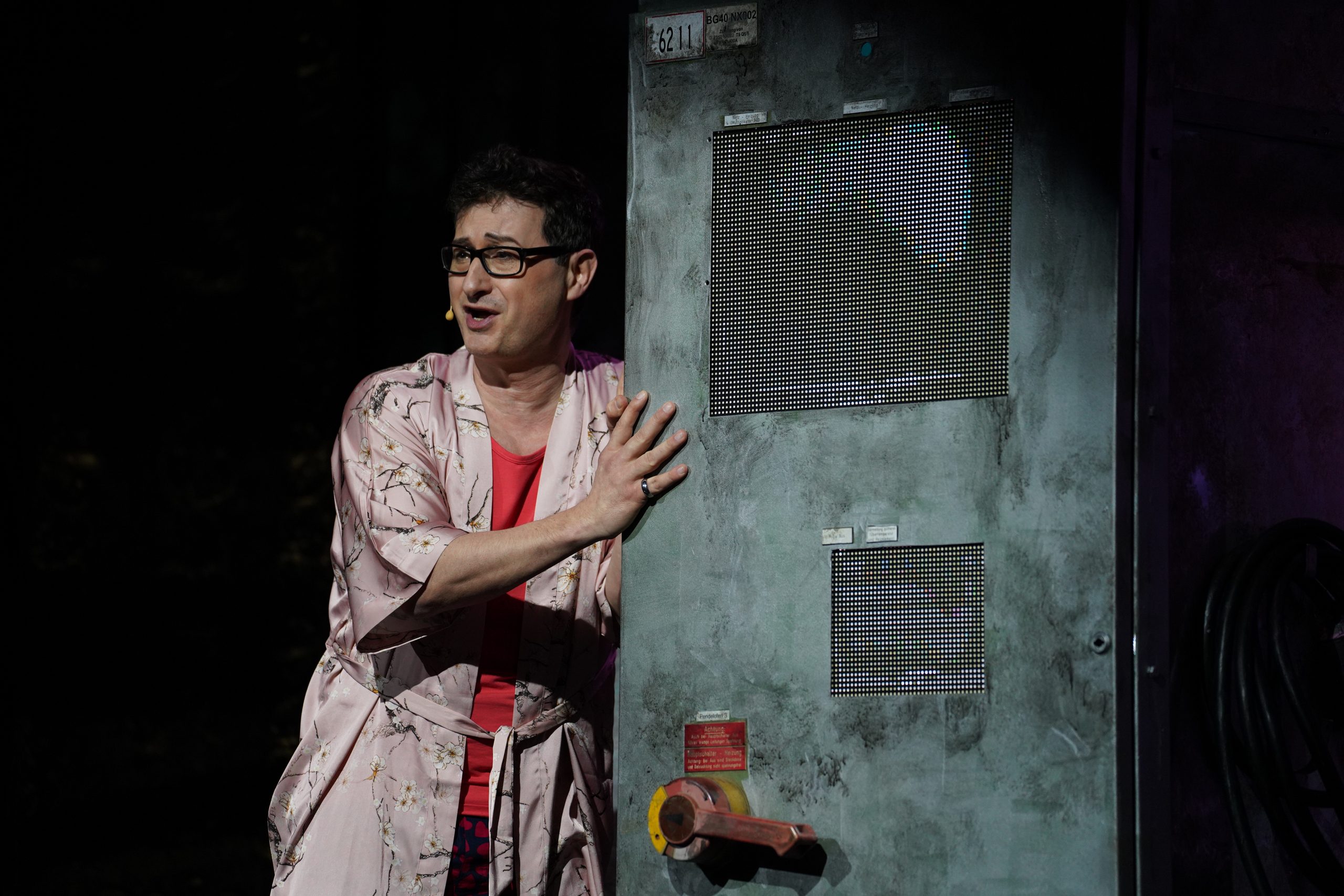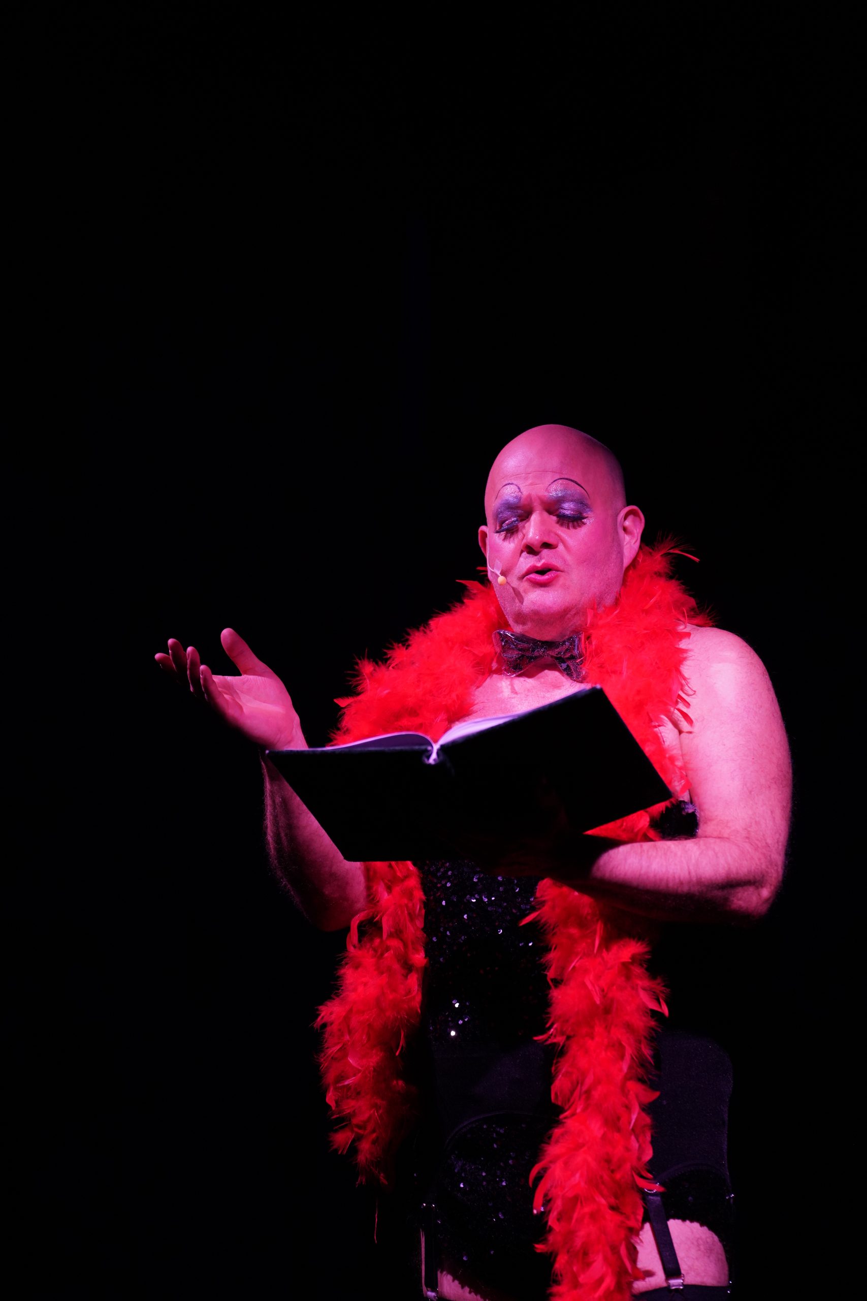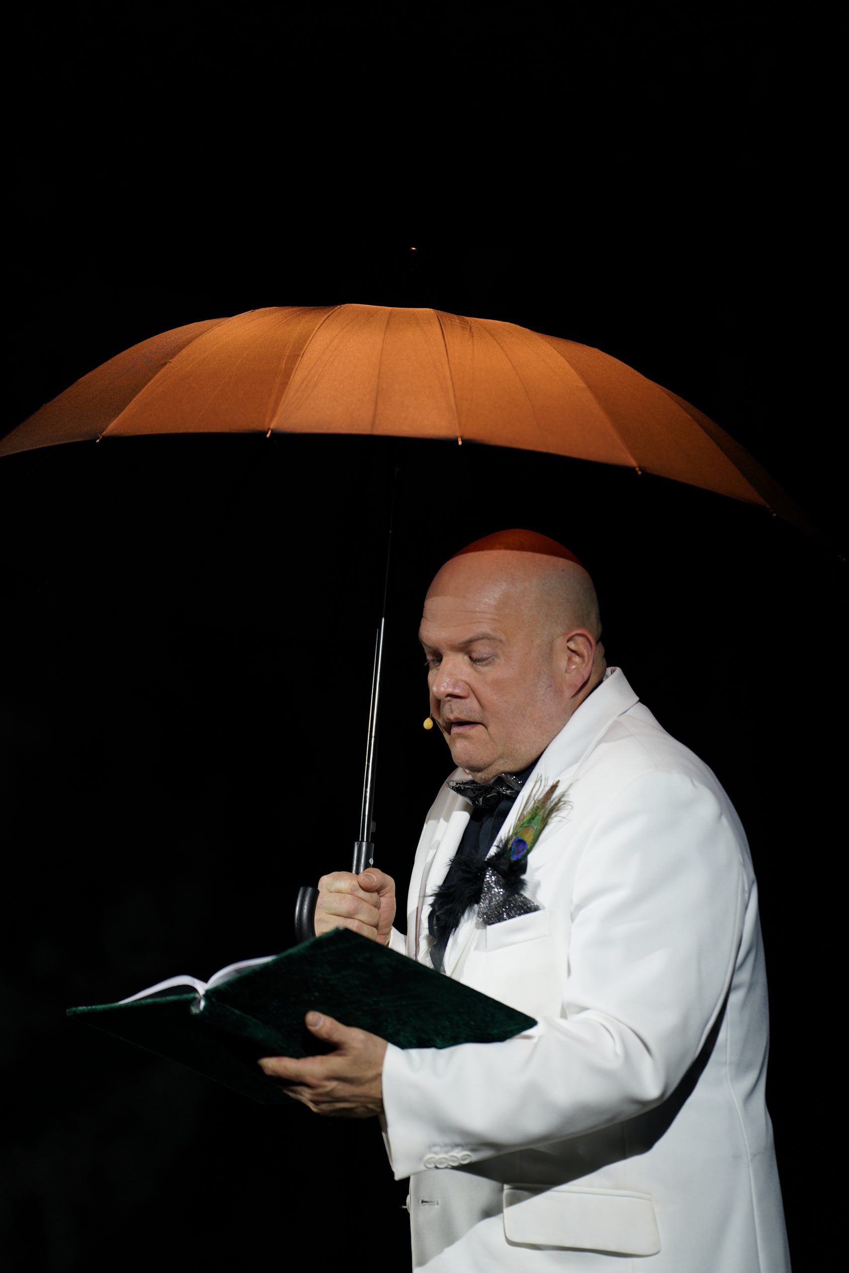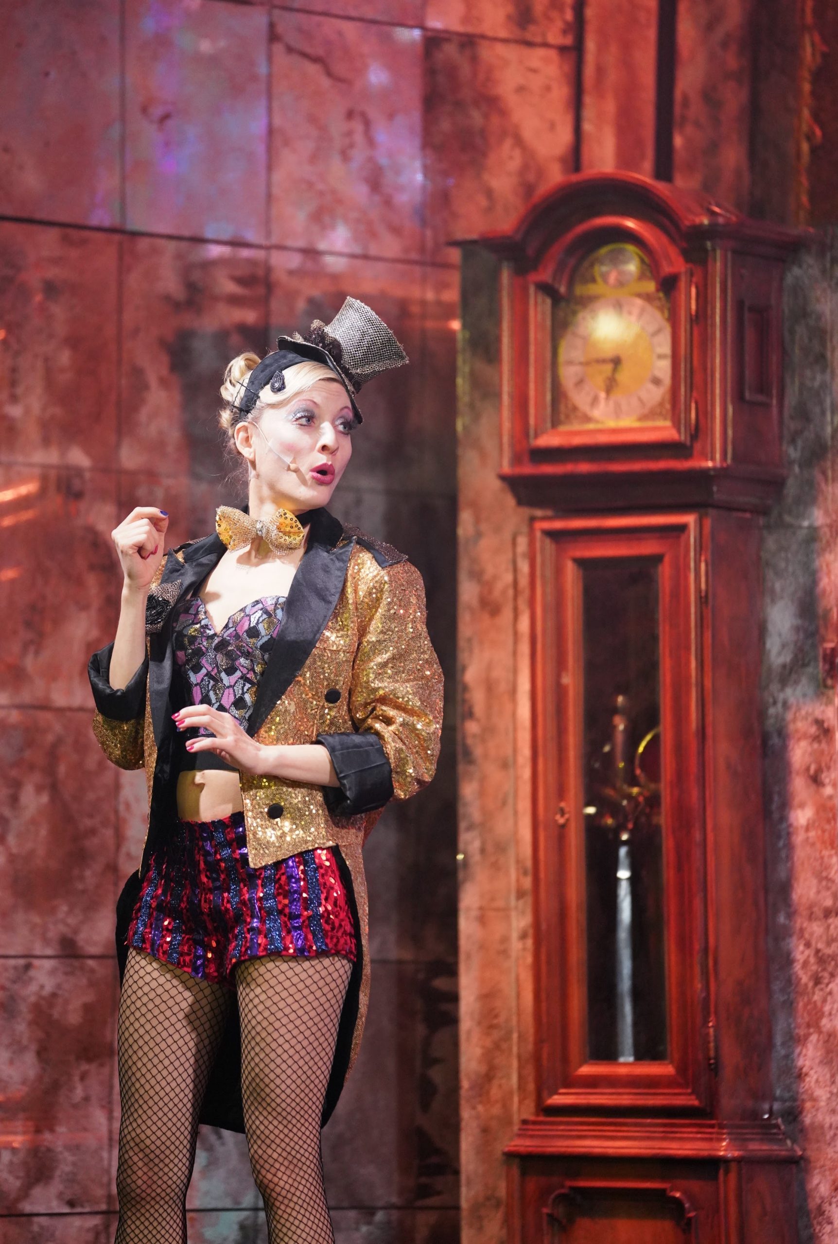 Der Erzähler (Christoph Fath, der auch für das Bühnenbild verantwortlich ist) wirkt fast ständig präsent – auf der Bühne und im Zuschauerraum, der eben auch teilweise in das Bühnenbild integriert ist. Das Publikum an den VIP-Tischen wird so mehr oder weniger freiwillig Teil der Handlung. Fath führt souverän durch den Abend und lässt sich auch von den typischen »Boring!«-Rufen nicht aus der Ruhe bringen. Nichts wirkt gestellt und gelernt, sondern alles spontan – genau so soll es sein.