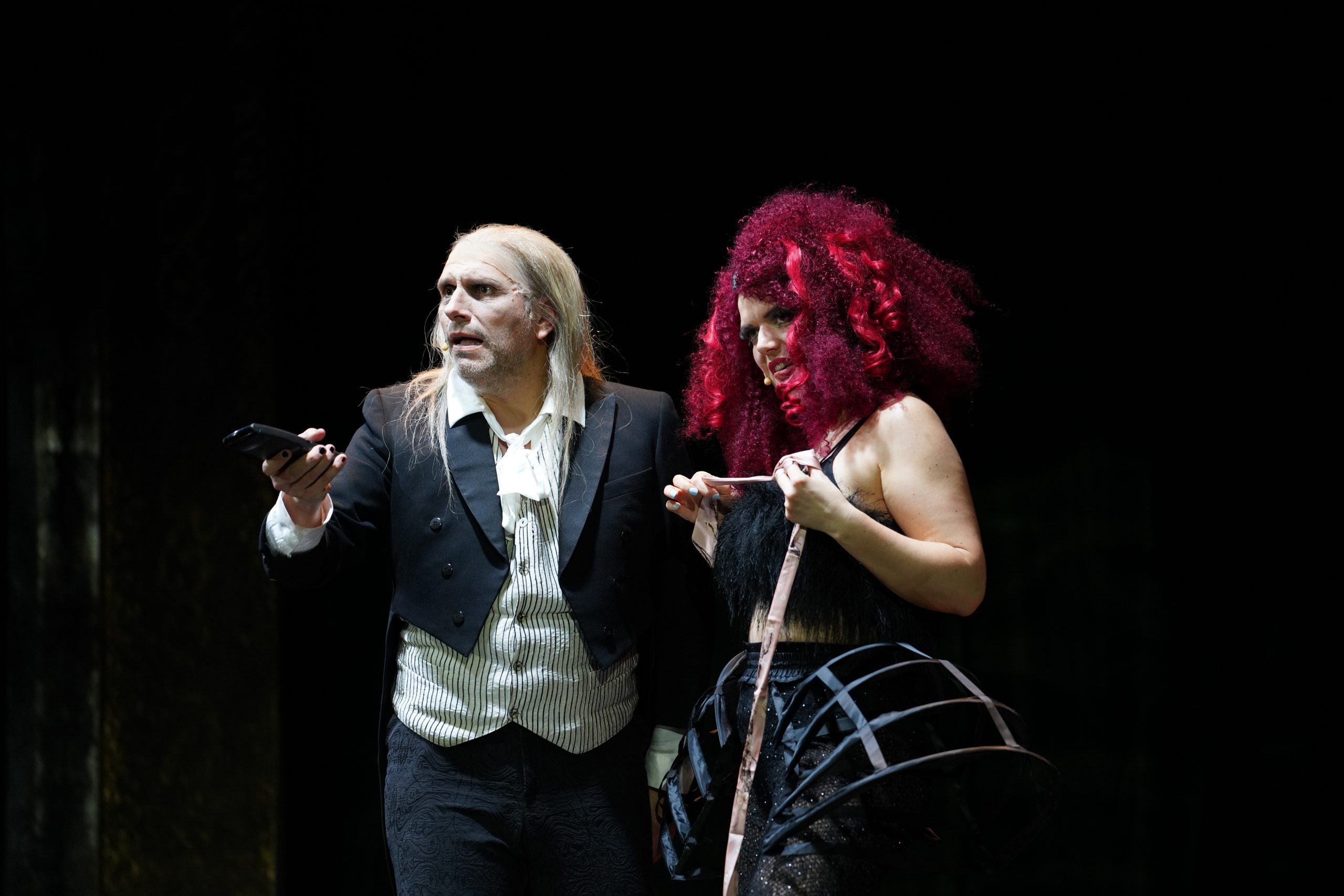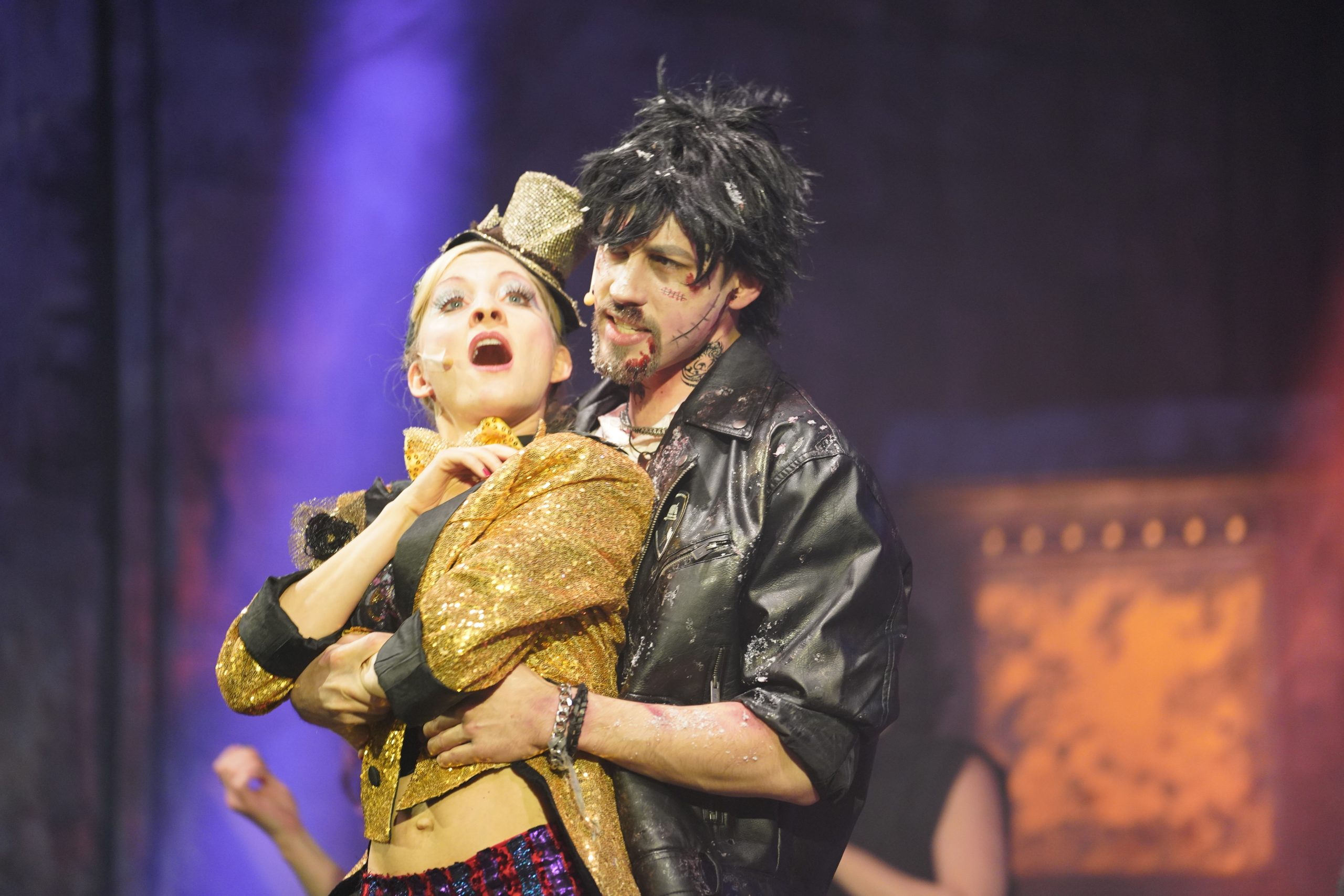 Janet (Hannah Toriser) und Brad (Reinhard Hirtl) – das naive Paar, das es durch eine Panne ins Schloss verschlägt – gewinnen das Publikum vom ersten Moment an. Beide durchlaufen eine deutliche Wandlung in den knapp 2 Stunden, die glaubhaft und berührend in jeder Phase bleibt. Und ja: Brad steht am Ende natürlich auch in Strapsen auf der Bühne. Ganz ehrlich: Wo erlebt man das, dass der Intendant sich so zeigt? (Gut, wir wissen noch nicht, wie mutig Alfons Haider diesen Sommer als Zaza sein wird …)
