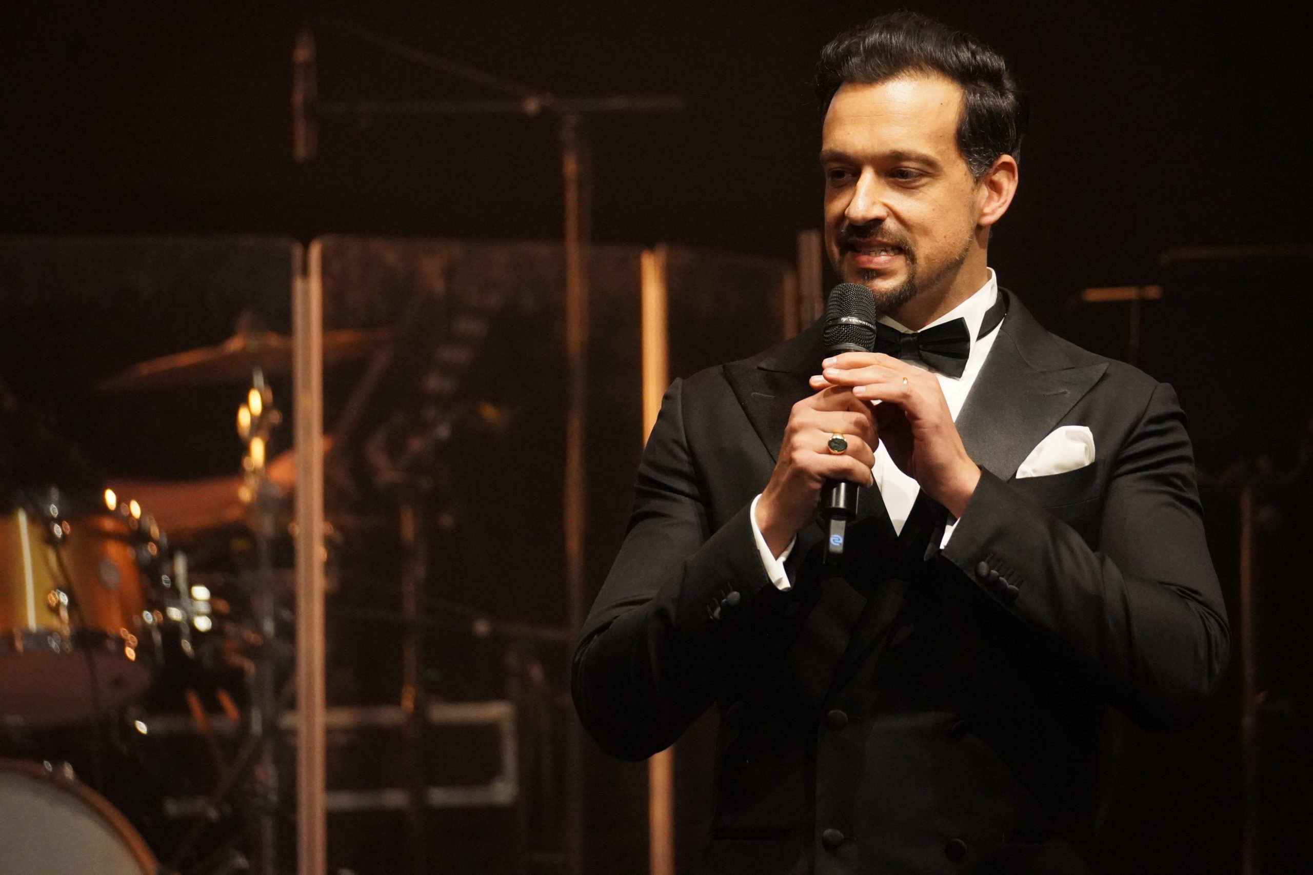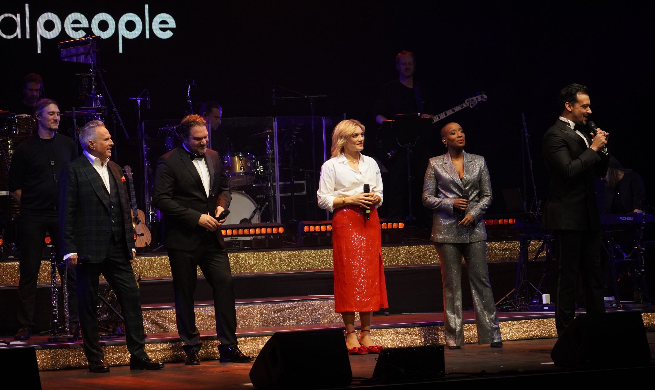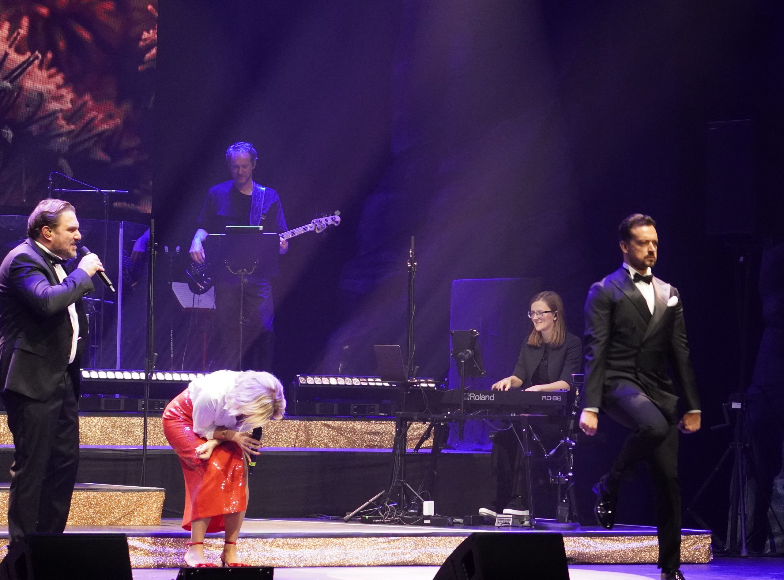 Wenn ich schreibe fünf, dann zähle ich bewusst Maximilian Mann dazu, der diesen Abend gekonnt charmant und lustig moderierte. Aber dazu später mehr. Mit Aisata Blackman, aktuell als Killerqueen in »We will rock you« zu sehen, Roberta Valentini, die in Stuttgart noch aus »Wicked« und »Ghost« bekannt sein dürfte, dem Graf Krolock Kevin Tarte und Karim Khawatmi (»Ich war noch niemals in New York«) startete der Abend gleich weihnachtlich mit ›Merry Christmas Everyone‹ und so ging es auch weiter. ›All I want for Christmas‹, ›Santa Baby‹, ›Winter Wonderland‹ und ›Santa Claus is coming to town‹ waren nur einige der Weihnachtslieder, mit denen es fröhlich, aber auch besinnlich losging.