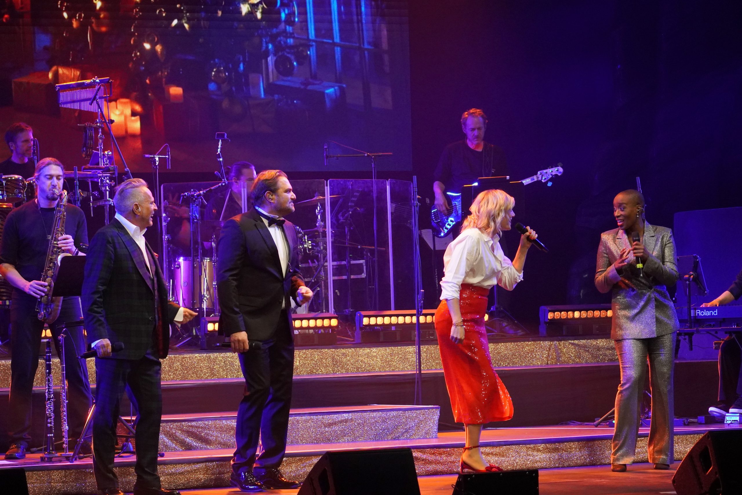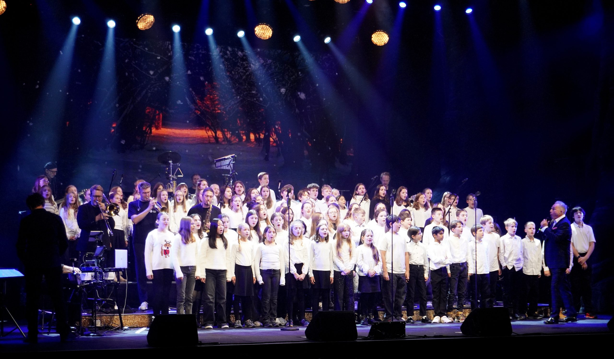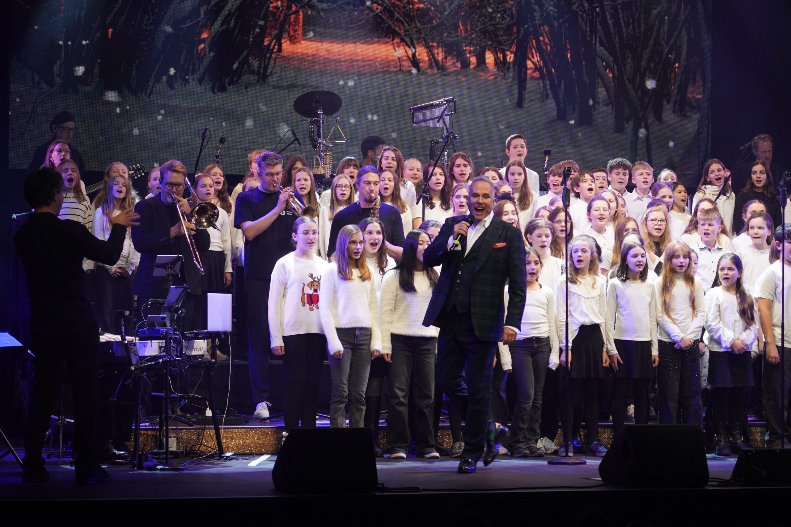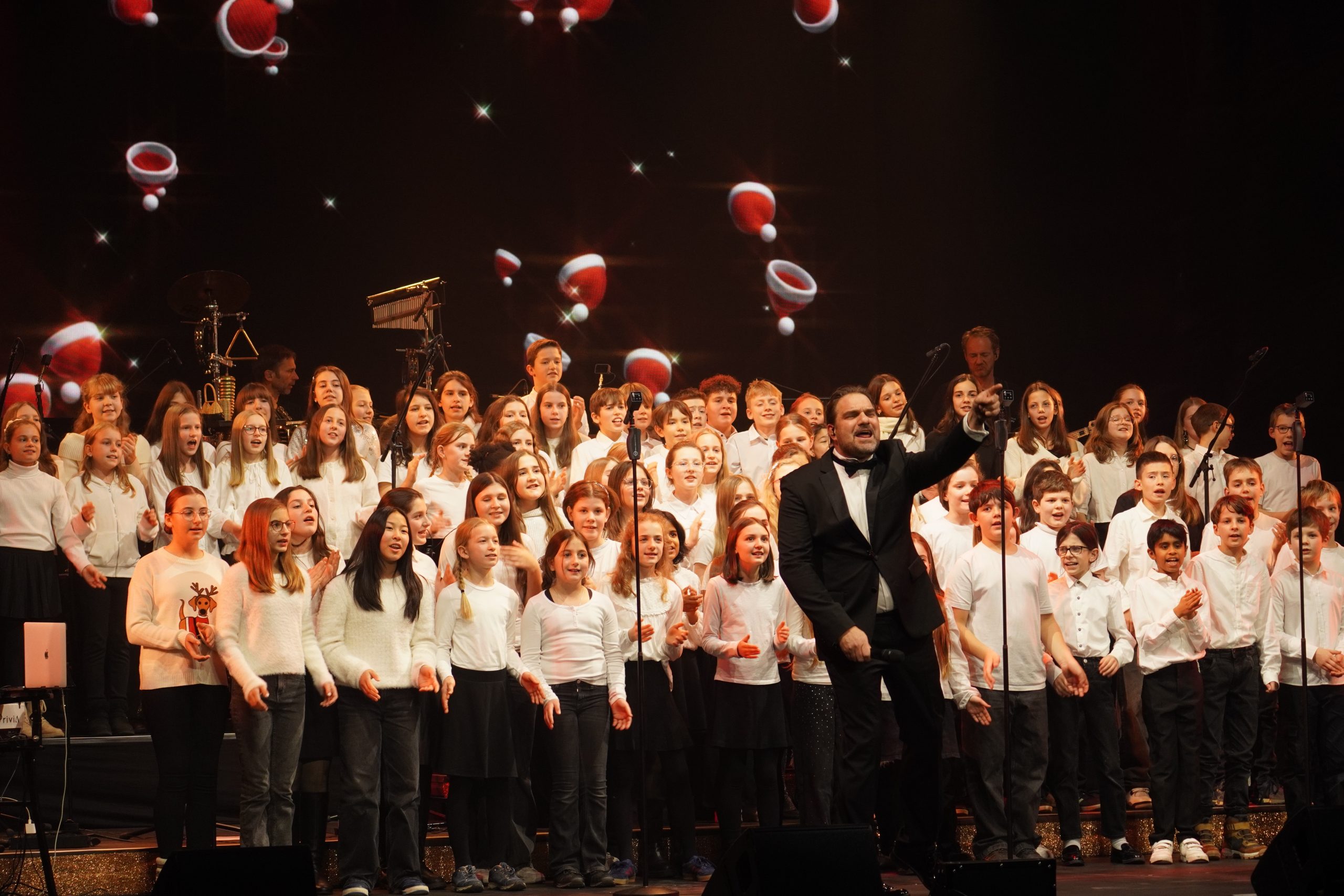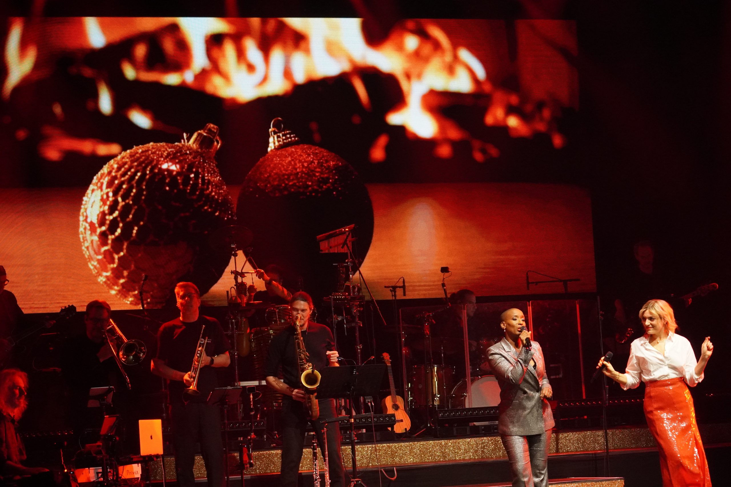 Für eine entsprechende Atmosphäre sorgte die große LED-Wand, auf der mal der Schnee leise rieselte, ein Kaminfeuer brannte oder Nikolausmützen flogen.